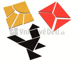 Farebné diely, z ktorých majú zakaždým prikladať k sebe tak, aby zobrazili štvorec, školákov zabavia a zároveň ich naučia, že jeden celok a zobrazenie roviny môže byť výsledkom spojenia rozličných častí. Súčasťou hry sú predlohy na stavanie obľúbených tangramov.