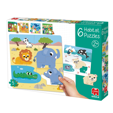 Sada 6 štvordielnych puzzle z tvrdeného kartónu, každé s iným zvieratkom vo svojom prirodzenom prostredí.